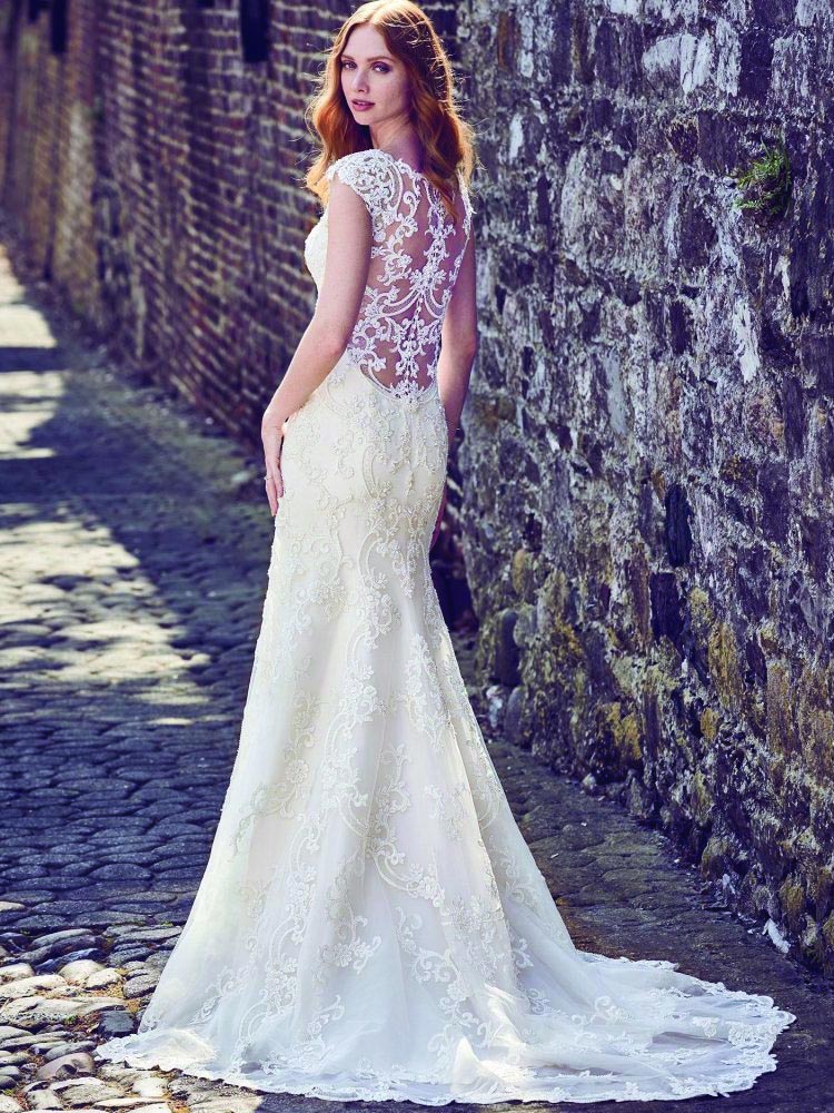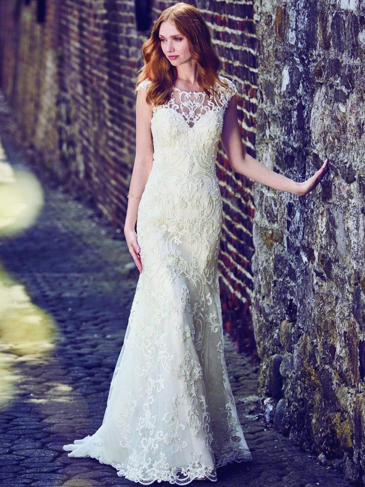 This elegant fit-and-flare wedding dress features a tulle overlay of beaded lace motifs, creating an illusion bateau over sweetheart neckline, illusion cap-sleeves, illusion scoop back, and beautiful scallop hemline. Finished with pearl buttons and zipper closure.