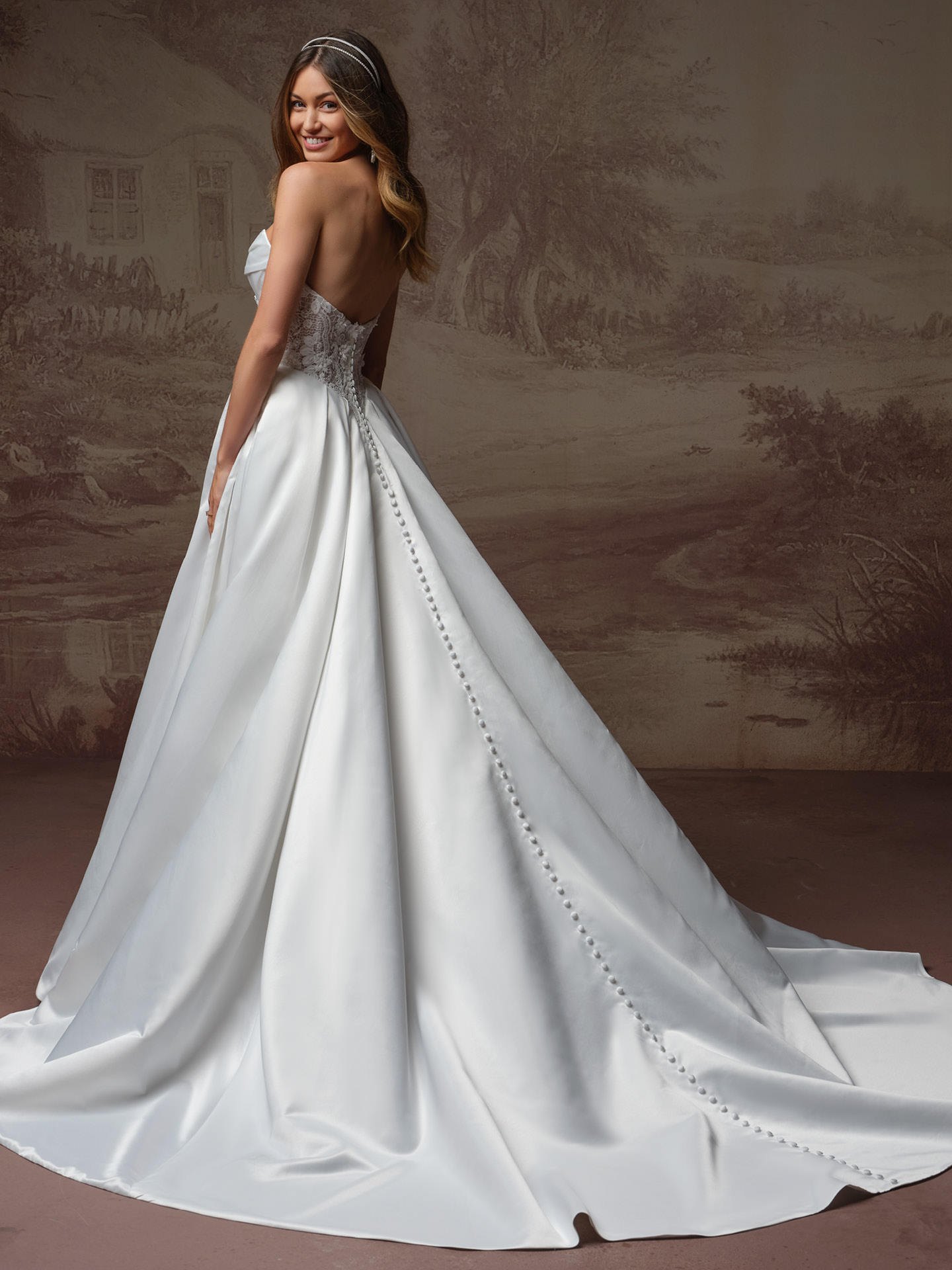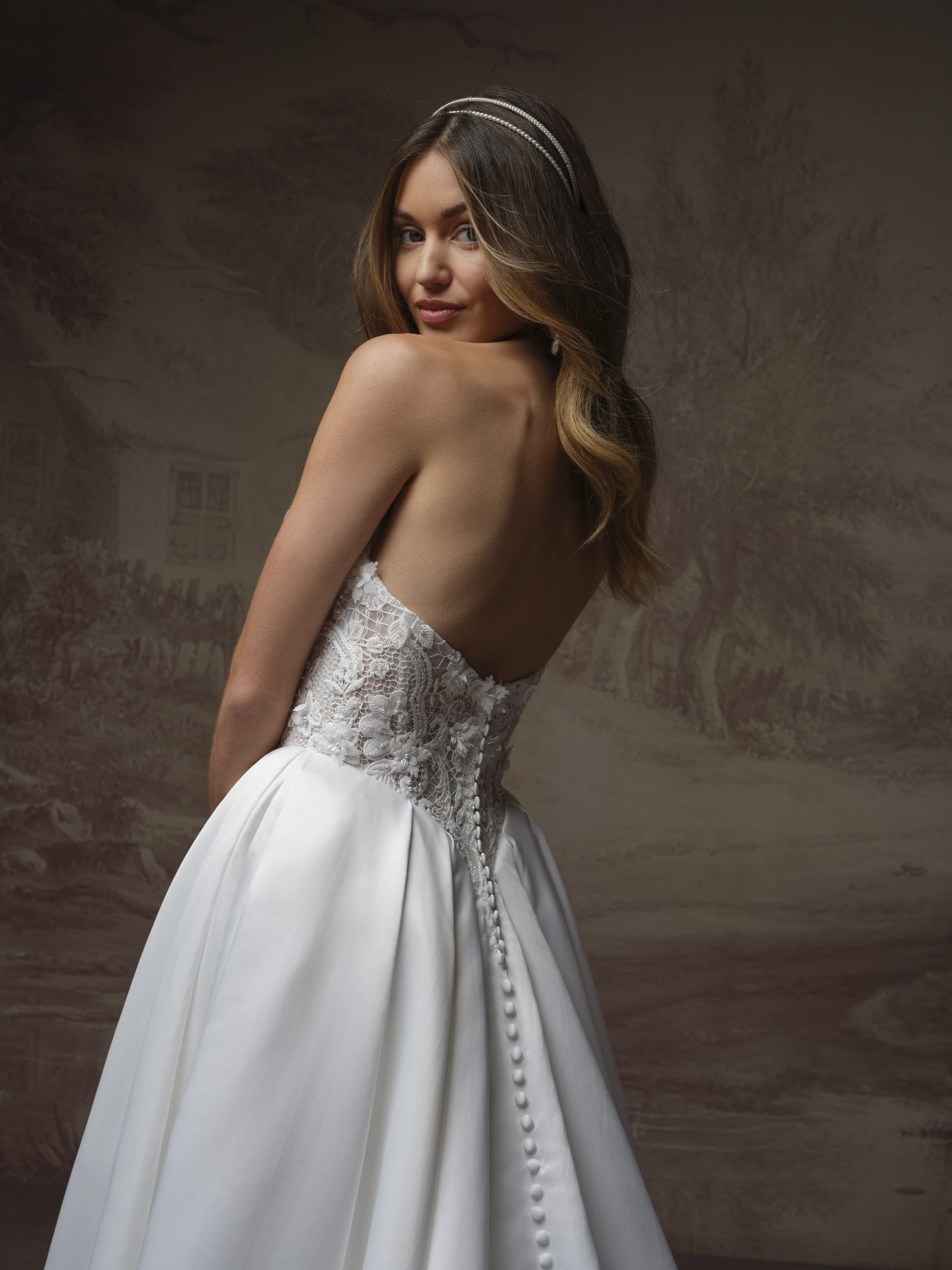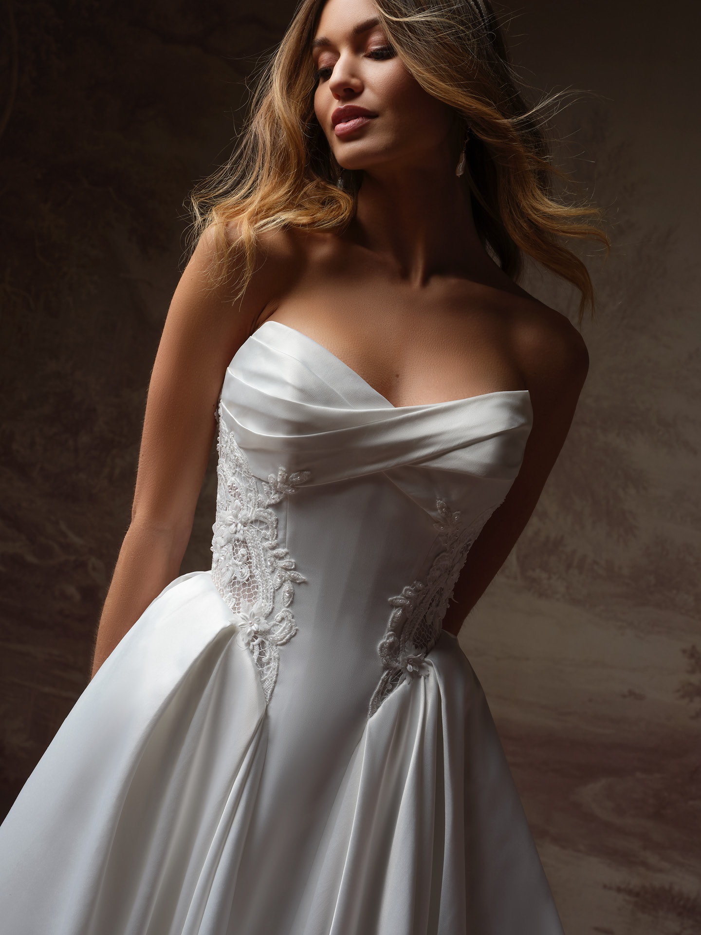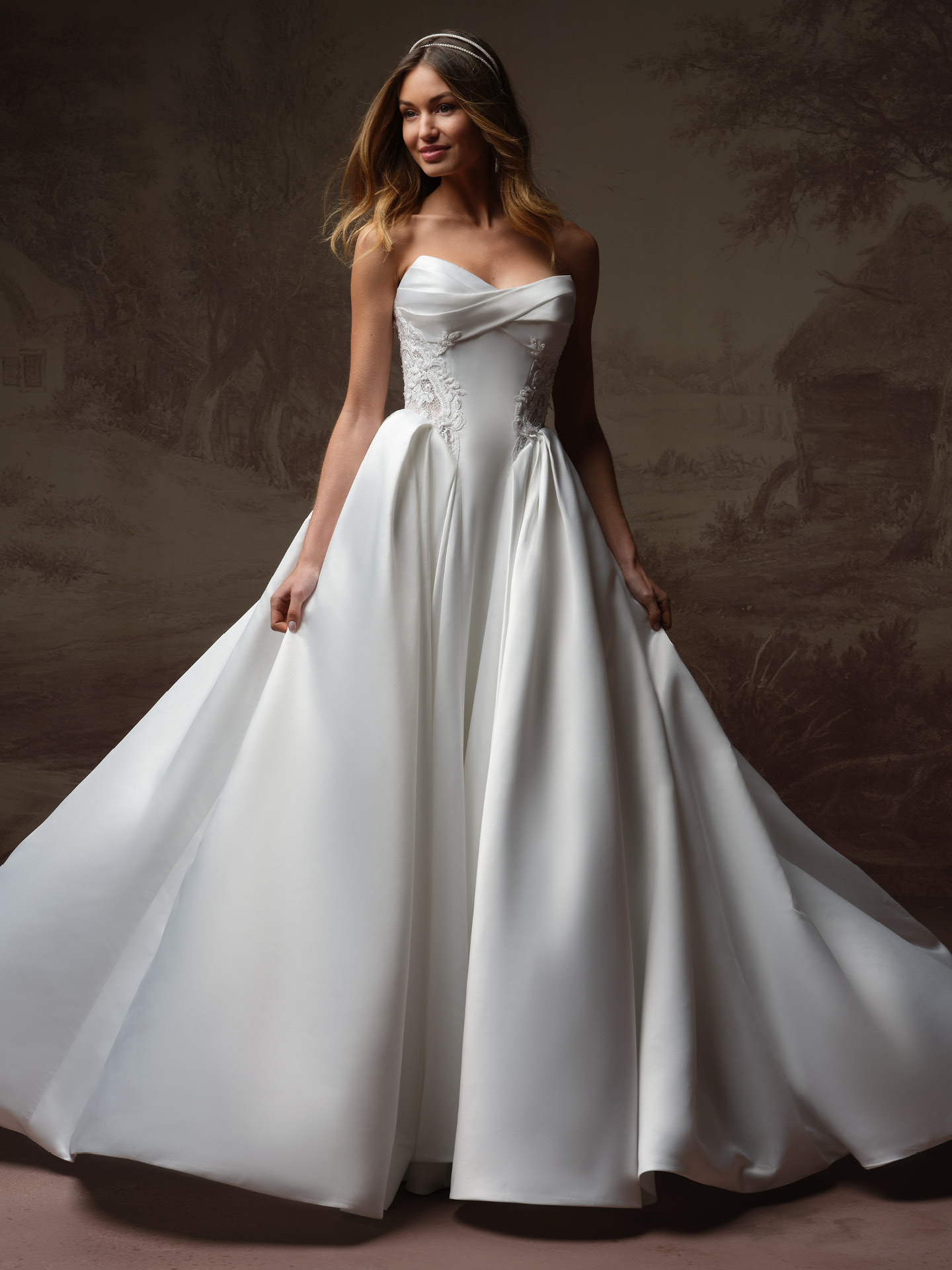 Classic ball gown with detailed side panels and corset bodice.